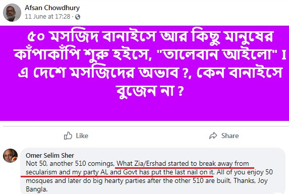 বাস্তবতা হচ্ছে আওয়ামী লীগ বা বিএনপি যারা করে তারা বাঙালী মুসলমানের যে গড় চরিত্র, সেটাই হাজির করেছে রাজনীতিতে। চরিত্র ও মননে মধ্যযুগীয় সামন্তবাদী, রাজনীতি ও ক্ষমতা চর্চায় সুলতানী এবং ধর্ম প্রশ্নে আবেগপ্রবণ, এসবের স্বমন্বয়ে গঠিত দ্বৈততাপূর্ণ আমাদের জাতীয় চরিত্র। এই ধরনের চরিত্রই আ’লীগ রিপ্রেজেন্ট করে। শাসকগোষ্ঠীর অংশীদার অন্যান্য দলগুলোর অবস্থাও প্রায় একই রকম। ফলে, তাঁদের পক্ষে পাশ্চাত্যের সেকুলারিজম কোন দিনই এখানে কায়েম করা সম্ভব নয়, দরকারও নেই। তবে, আ’লীগকে রক্ষণশীলদের সন্দেহ করার বাস্তবিক আরেকটা কারন হচ্ছেঃ আ’লীগে বামপন্থী ও সাবেক ভারতীয় জাতীয় কংগ্রেসিদের অনুপ্রবেশ। পাকিস্তান আমল থেকেই এই অনুপ্রবেশের কারনে দলের পাবলিক চরিত্র নিয়ে রক্ষণশীলদের মধ্যে মাঝে মাঝে সংশয় তৈরি হয়। আ’লীগকে বিভিন্ন সময় এই সংশয় দূর করতে বিভিন্ন কৌশল নিতে দেখা গেছে। এখন সেটা কাটিয়ে ওঠার চেষ্টা করছে ধর্মপন্থীদের সাথে ‘লাভ-হেইট’ খেলে এবং বৈধতা অর্জন করতে চাচ্ছে মসজিদ প্রজেক্টের মাধ্যমে। এতে কি কাজ হবে? রাষ্ট্রীয় প্রতিষ্ঠানগুলো ধ্বংস করে, গণতন্ত্রকে নস্যাৎ করে যে পর্যায়ে রাষ্ট্রকে এনেছে, সেটা থেকে উত্তরণ এত সহজে হবে বলে আমার মনে হয় না।